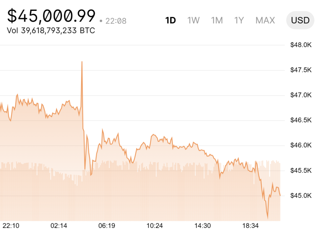 在SEC澄清尚未批准比特币ETF后,比特币价格很快跌破46000美元。截至记者发稿,比特币价格更是接近跌破45000美元,过去24小时价格跌幅超过4%。
