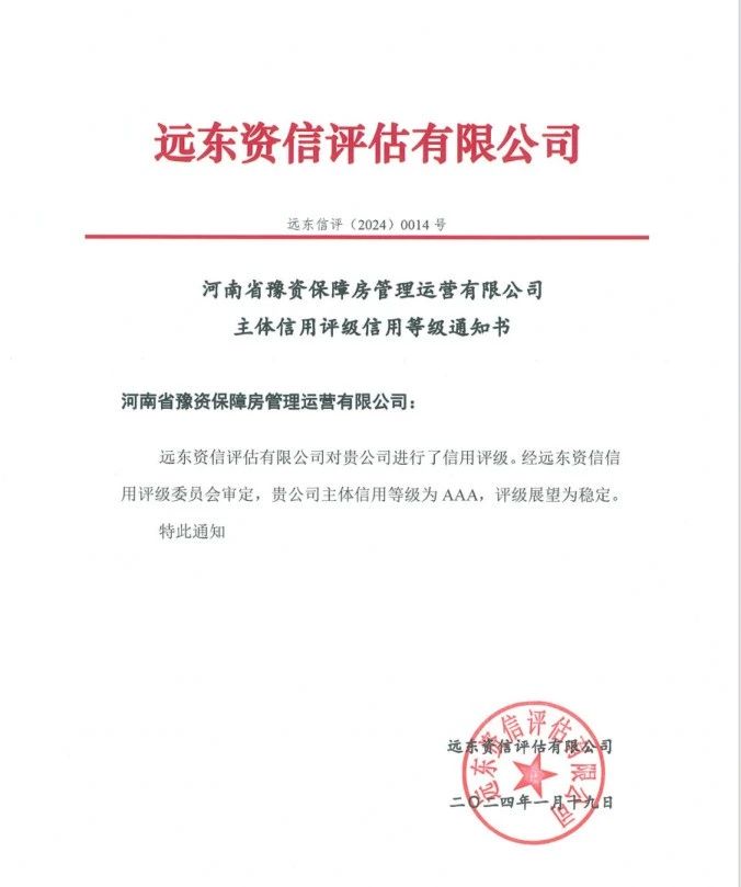 1月20日,大河财立方记者获悉,1月19日,河南省豫资保障房管理运营有限公司(以下简称豫资保障房)经远东资信评估有限公司综合评估,企业主体信用获评AAA最高等级,评级展望为稳定。