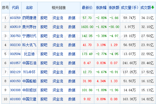 个股成交金额方面,截至午间收盘,药明康德位列两市第一,成交金额34.21亿元;贵州茅台位列两市第二,成交金额32.10亿元。