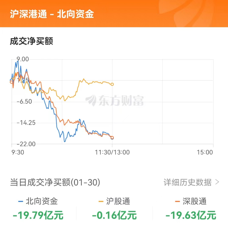 截至午间收盘,北向资金净流出,其中沪股通净流出0.16亿元,深股通净流出19.63亿元,合计净流出19.79亿元。