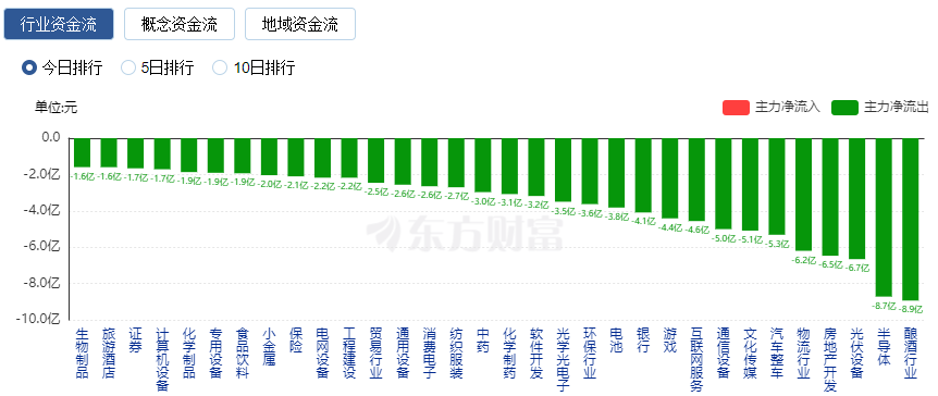 净流出方面,酿酒、半导体排名靠前,其中酿酒净流出8.9亿元。