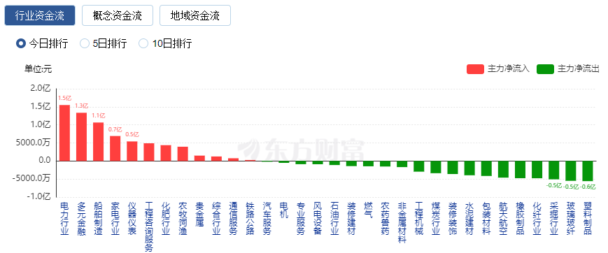 行业资金方面,截至午间收盘,电力、多元金融等净流入排名靠前,其中电力净流入1.5亿元。